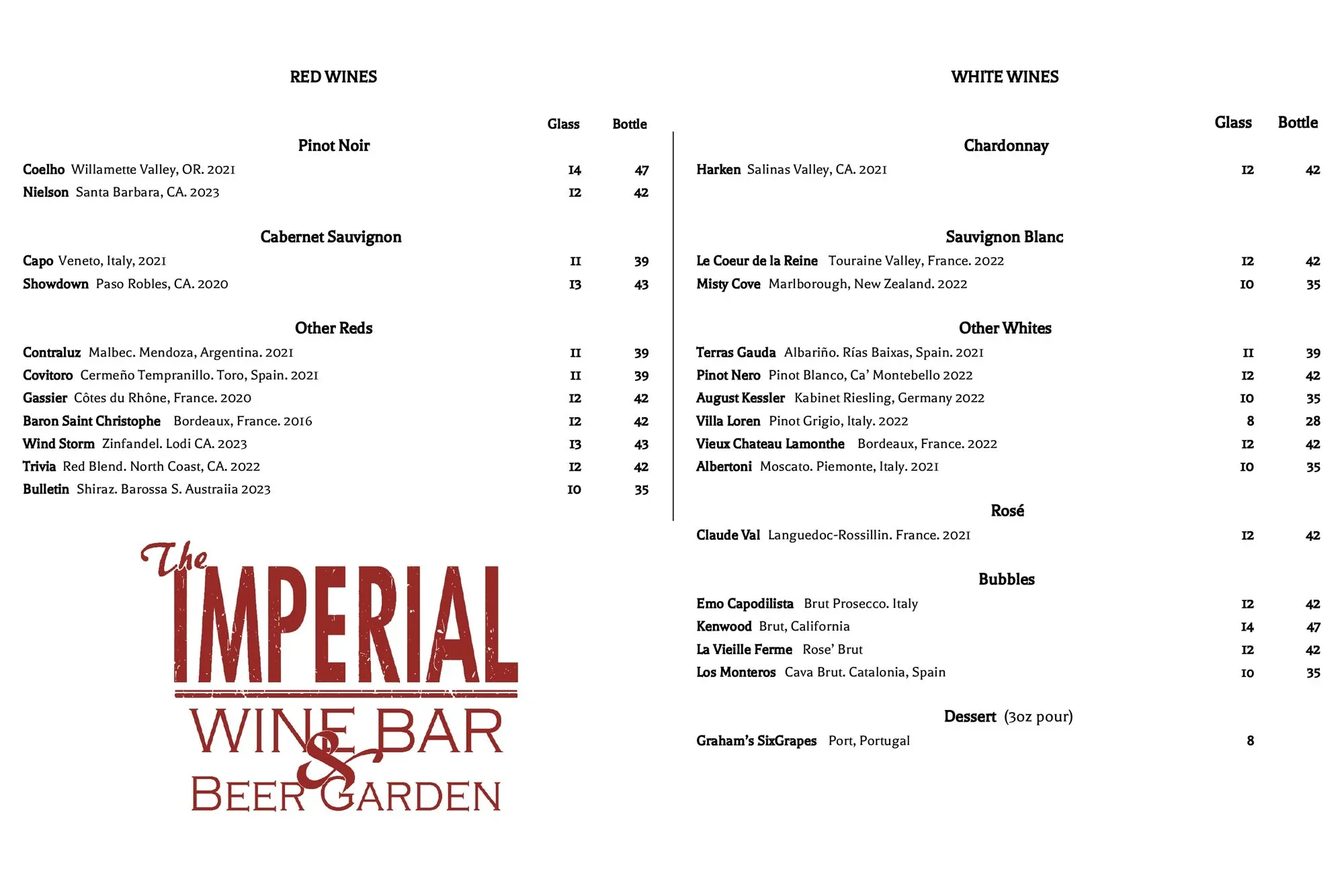 With over 35 beers and 35 wines to choose from, The Imperial has something to offer every beer and wine drinker, from the novice to the adventurous. Our bartenders are always happy to help find the perfect drink for you. We are a neighborhood bar. A pub. In keeping with that tradition, kindly order at the bar as we do not offer table service. If you get hungry, you can count on our kitchen for reliable, elevated bar snacks–from cheese plates to flatbreads, we've got you covered!